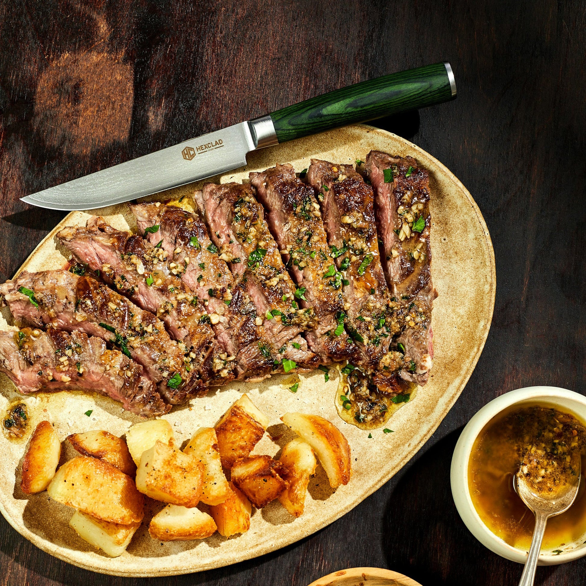 Our 4-piece steak knife set is for those who want to savor¨Cnot saw¨Ctheir favorite cuts. Made to the same exacting standards as our chef¡¯s knife, each blade is forged from 67 layers of Japanese Damascus steel for unbeatable sharpness, gliding through any protein. Unique green pakkawood handles elevate table settings.
